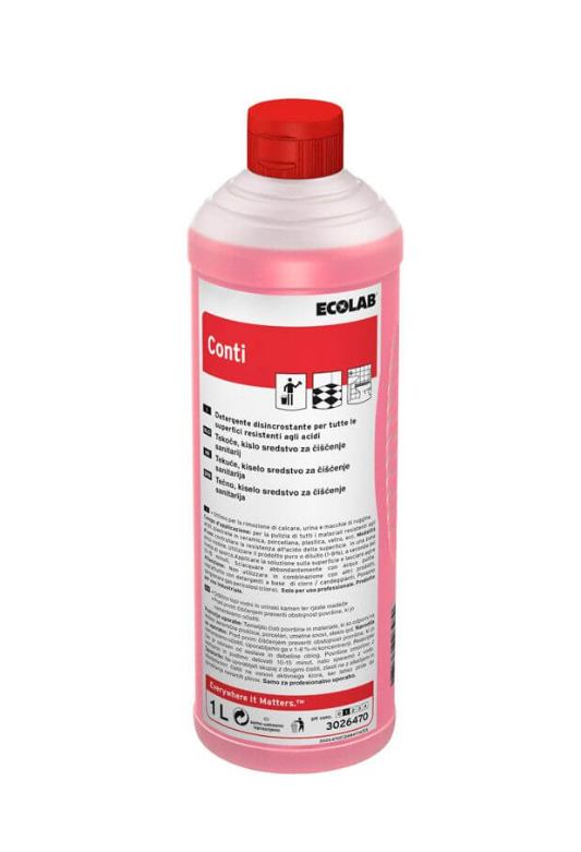 Conti je visokoučinkovito kiselo sredstvo namijenjeno za svakodnevno održavanje sanitarnih prostora te za temeljito uklanjanje tvrdokornih zaprljanja i naslaga kamenca. Zahvaljujući svojoj snažnoj formulaciji, idealno je za upotrebu u kupaonicama, toaletima, svlačionicama i drugim prostorima gdje je potrebna dubinska higijena.