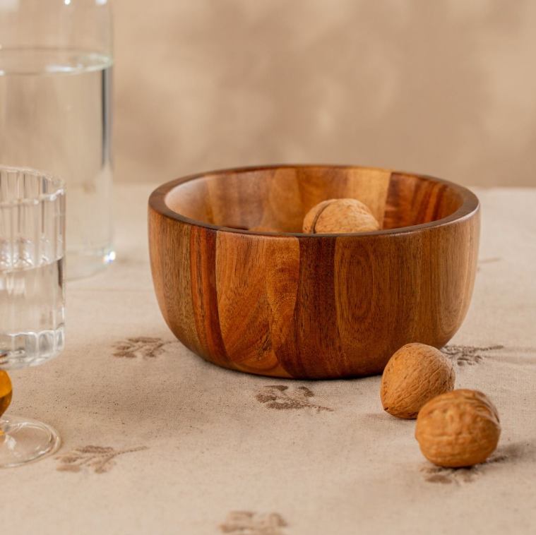 Namjena: Zdjela promjera 16 cm i visine 7 cm savršena je za posluživanje voća, orašastih plodova, grickalica ili drugih manjih zalogaja. Zahvaljujući jednostavnom obliku i prirodnom materijalu, odlično se uklapa u različite stilove uređenja – od rustikalnog do modernog.