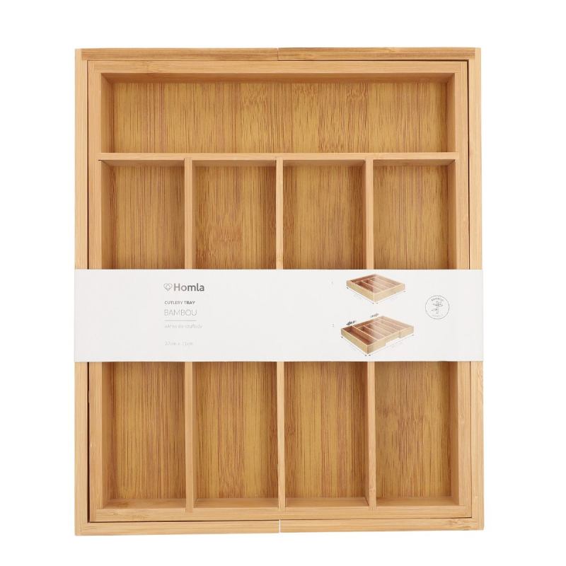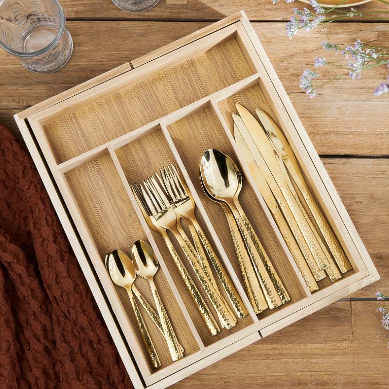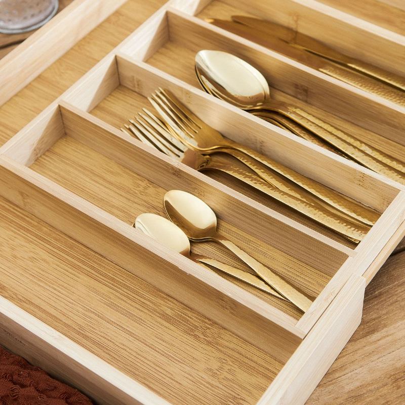 Organizirajte svoju kuhinju s elegantnim i funkcionalnim držačem od prirodnog bambusa. Zahvaljujući podesivom dizajnu, lako se prilagođava različitim veličinama ladica, pružajući preglednost i red u svakodnevnom korištenju kuhinjskog pribora.