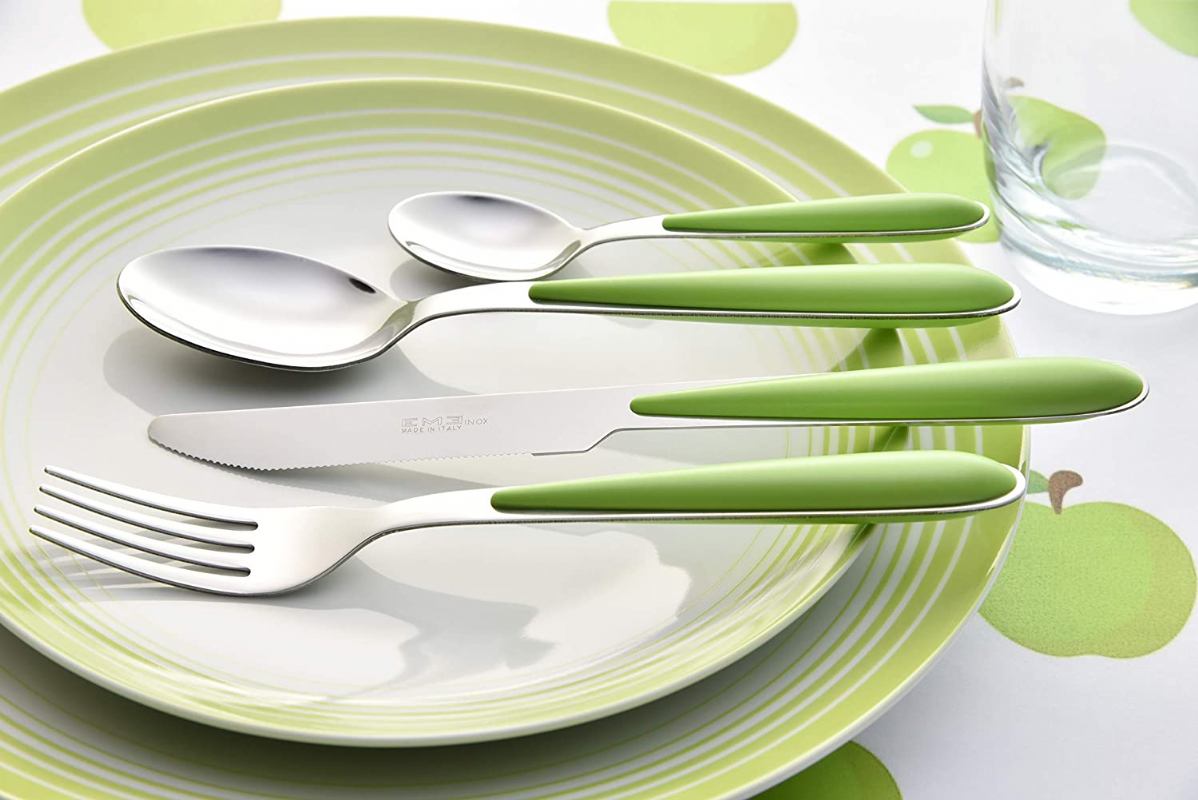 Komplet pribora za jelo, marke Eme sastoji se od 24 dijelova. Komplet je izrađen od nehrđajućeg čelika 18/0 s poliranim završnim slojem i ručkom zavarenom ultrazvukom u ABS dršci.