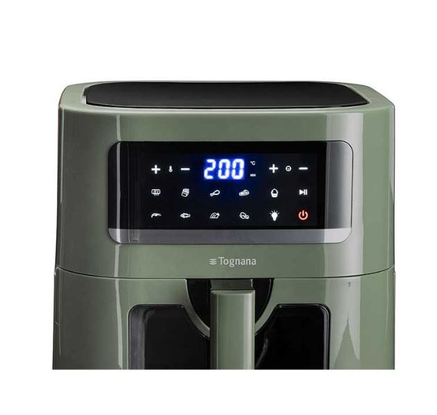 Zdravo kuhanje uz stil. Friteza na vrući zrak Tognana Iridea kapaciteta 7 litara u boji zelene kadulje dio je nove linije malih kućanskih aparata s retro izgledom, savršeno uklopivih u svaku kuhinju. Zahvaljujući digitalnom zaslonu i 9 unaprijed postavljenih programa, omogućuje pripremu raznih jela bez dodavanja ulja – brzo, jednostavno i zdravo.