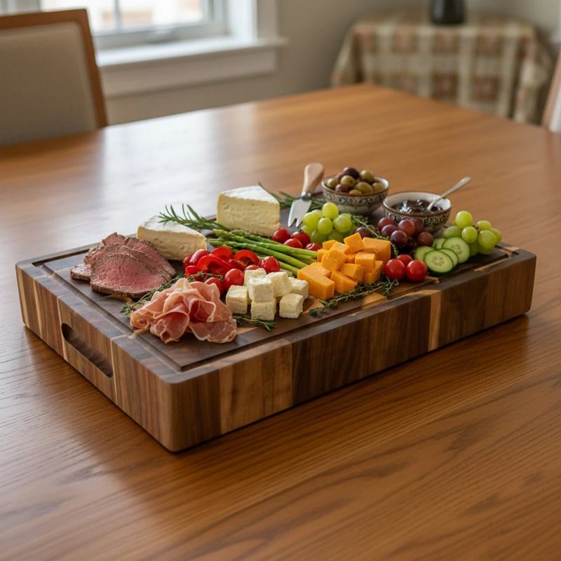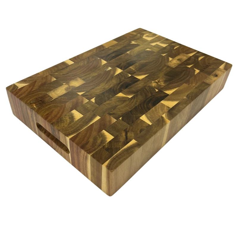 Masivna kuhinjska daska izrađena od vrlo tvrdog bagremovog drva (Acacia) s end-grain tehnikom pruža iznimnu otpornost, dugotrajnost i estetsku vrijednost. Površina sastavljena od poprečnih vlakana omogućuje da oštrica noža ulazi između vlakana, čime se smanjuje trošenje noževa i produžuje vijek trajanja daske. Daska je obostrano upotrebljiva – s jedne strane ima kanalicu za tekućine, a s druge ravnu površinu za rezanje i serviranje.