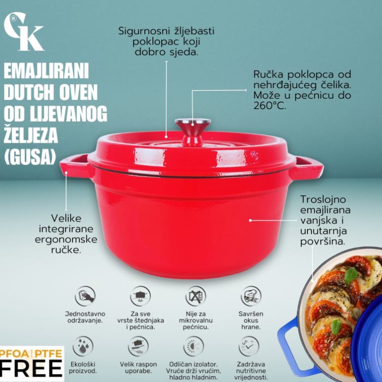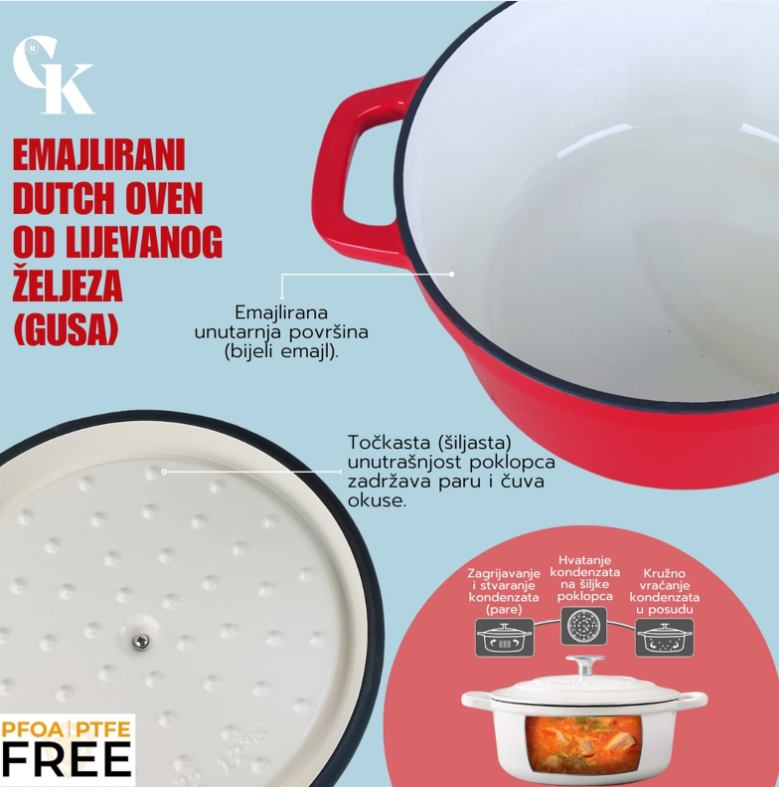 Grill King Dutch oven izrađen je od visokokvalitetnog lijevanog željeza s troslojnim emajliranim premazom, osmišljen za precizno kuhanje i pečenje. Zahvaljujući svom obliku i materijalu, ravnomjerno raspoređuje toplinu i zadržava je tijekom pripreme jela, čime osigurava savršene rezultate u svakoj fazi kuhanja.