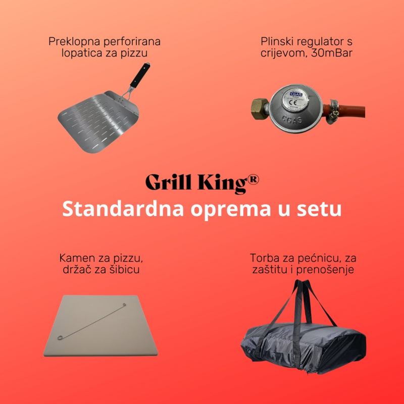 Grill King plinska pećnica za pizzu kompaktna je, lagana i iznimno učinkovita pećnica koja omogućuje pripremu savršeno pečene pizze u samo jednoj minuti. Zahvaljujući snažnom plameniku od 4,2 kW i maksimalnoj temperaturi od 500 °C, postiže rezultate usporedive s tradicionalnim pećima na drva, ali bez dima i uz potpunu kontrolu.
