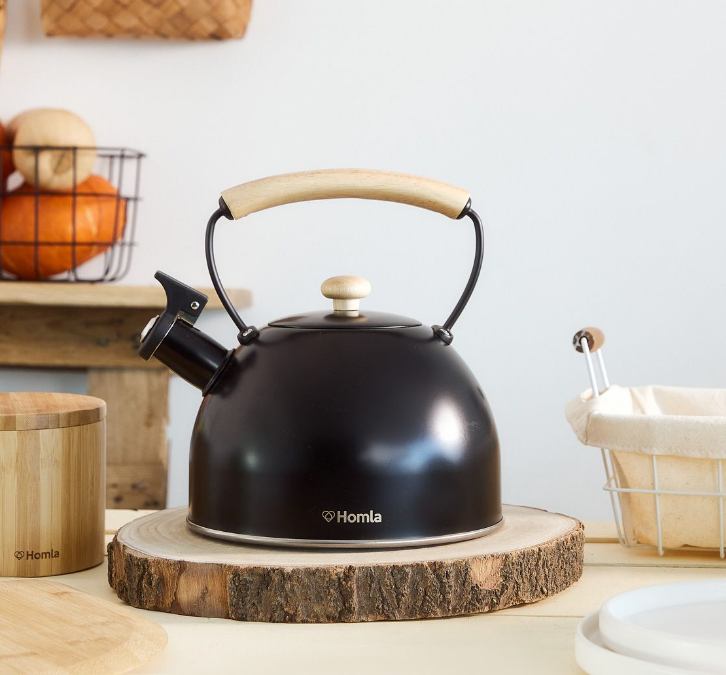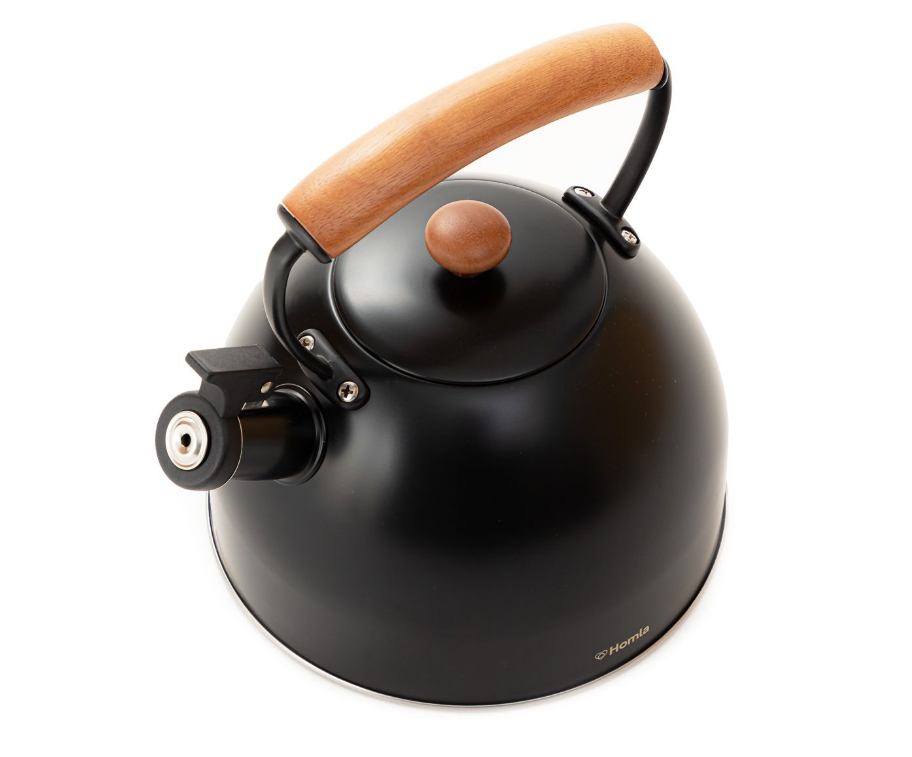 Čajnik zapremine 2,5 litara u crnoj boji s drvenom ručkom, idealan je za svakodnevno kuhanje vode za pripremu čajeva, kave i drugih toplih napitaka. Izrađen od nehrđajućeg čelika, otporan je na visoke temperature i pogodan za sve vrste kuhinjskih ploča uključujući indukcijske. Ručka i gumb na poklopcu izrađeni su od bukovog drveta koje se ne zagrijava, što omogućuje sigurno rukovanje čak i kada je čajnik pun kipuće vode.