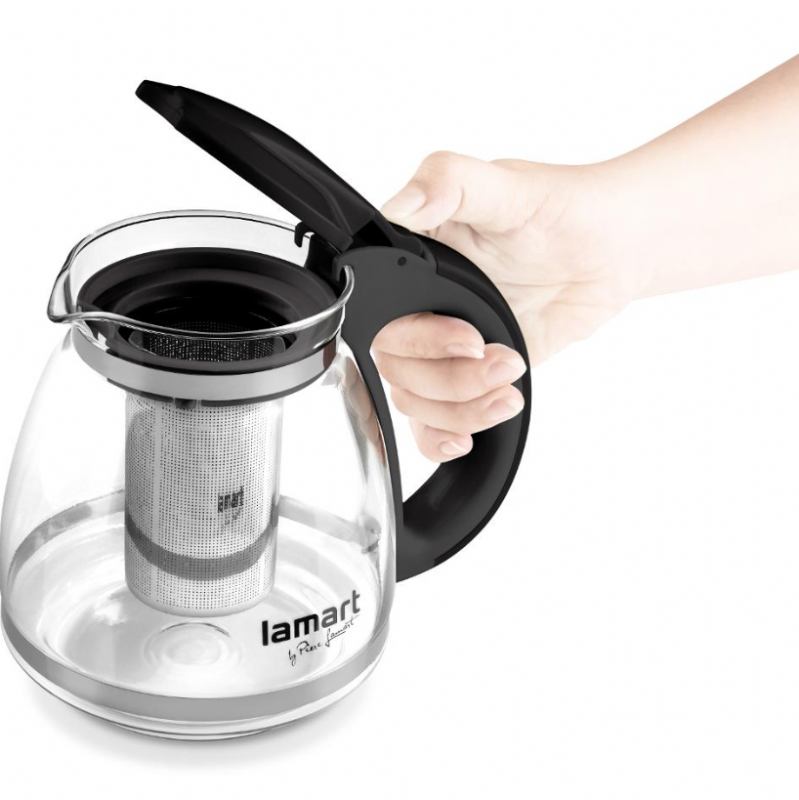 Opremljen je ručkom od otporne plastike, što omogućuje sigurno i udobno korištenje. Dodatno, čajnik sadrži cjedilo od nehrđajućeg čelika, koje učinkovito prikuplja listiće čaja, komadiće voća ili bilja, olakšavajući pripremu aromatičnih napitaka.
