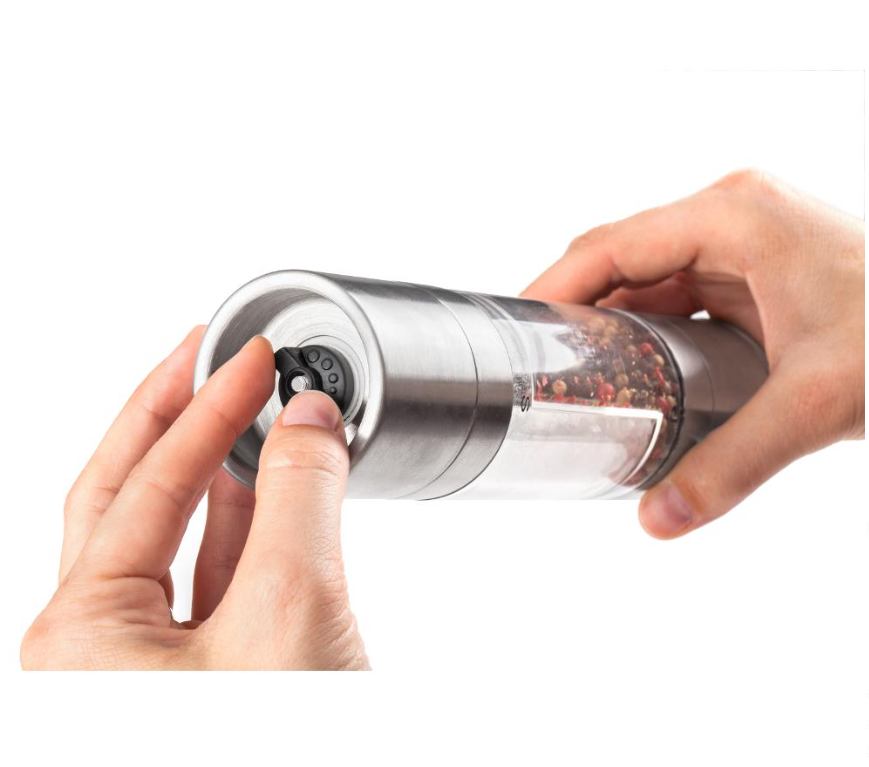 Dva prozirna lijevka omogućuju jednostavno praćenje količine začina unutar mlinca, čime se olakšava nadopuna i kontrola potrošnje. Mehanizam za mljevenje upravlja se okretanjem na obje strane, pružajući praktičnost i lakoću korištenja.