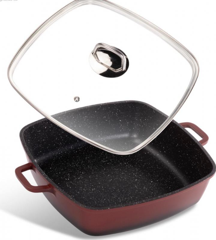 Lonac s poklopcem dimenzija 28 x 28 cm i kapaciteta 4,8 l izrađen je od vrlo izdržljivog aluminija, što osigurava dugotrajnost i ravnomjernu raspodjelu topline. Neljepljiva površina otporna je na grebanje i spaljivanje, omogućujući pripremu hrane bez lijepljenja i zagorijevanja.