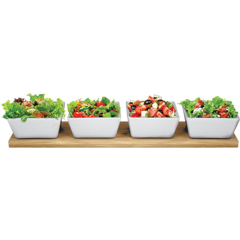 Porculanska serija za svakodnevnu upotrebu. Komplet sadrži 4 zdjele i drveni pladanj.