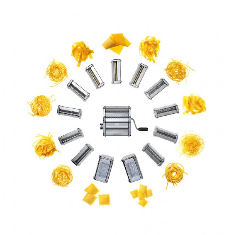 Marcato Atlas 150 mašinica za tjesteninu omogućuje jednostavnu pripremu raznih oblika, od špageta i lazanja do raviola i fettucina. S deset postavki za regulaciju debljine i valjcima izrađenima od anodiziranog aluminija, osigurava preciznu i zdravu izradu tjestenine. Uz uključene nastavke za lazanje (150 mm), fettucine (6 mm) i taglioline (1,5 mm), dodatno se može proširiti s još 12 nastavaka koji se kupuju zasebno.