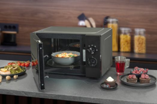 Hisense H23MOBP2H4 mikrovalna pećnica snage 800 W u crnoj boji donosi praktičnost i učinkovitost u vašu kuhinju. S kapacitetom od 23 litre i kompaktnim dimenzijama, savršena je za pripremu raznovrsnih jela. Mikrovalna koristi standardnu HVT tehnologiju s ravnomjernom raspodjelom zagrijavanja putem okretne ploče, što osigurava odlične rezultate kod zagrijavanja i kuhanja. Jednostavno upravljanje omogućuje ručna kontrola s funkcijom vremenskog podešavanja do 35 minuta. Uz dodatnu opciju odmrzavanja, ovaj uređaj kombinira funkcionalnost i moderan dizajn.
