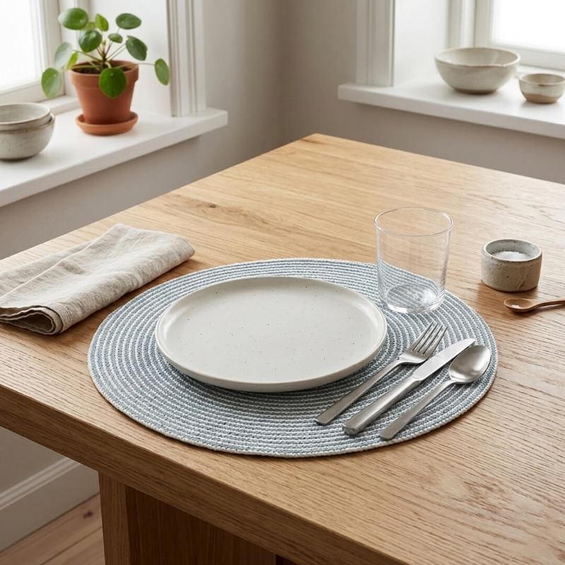 Njegova modra boja sa sivim podtonom izuzetno je svestrana te se lako uklapa u različite stilove interijera — od modernih i minimalističkih do klasičnih i toplih prostora. Spiralni uzorak daje podlošku dekorativan, ali nenametljiv izgled koji podiže cjelokupnu estetiku stola.