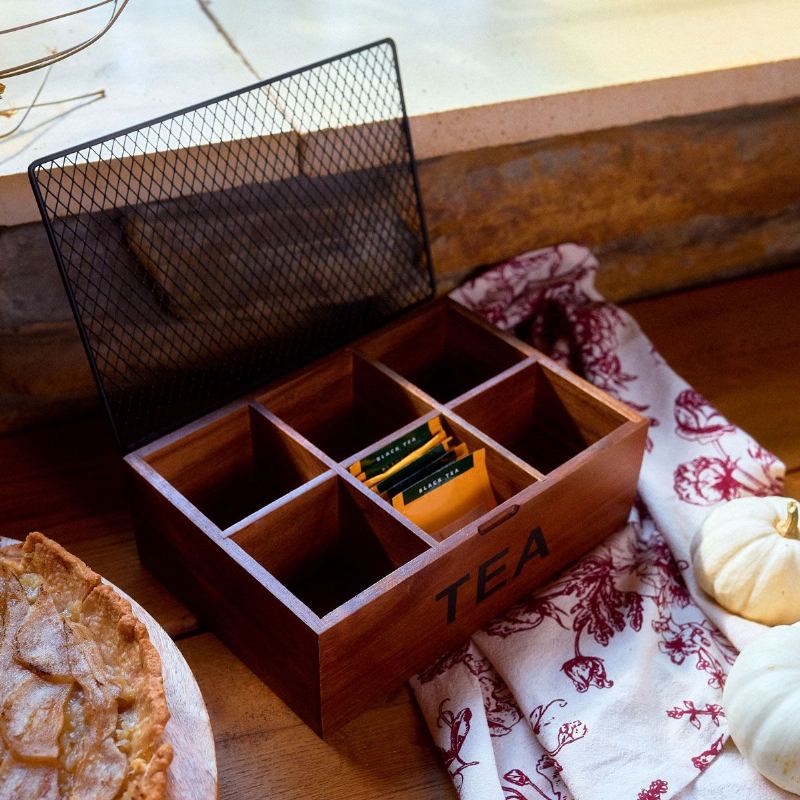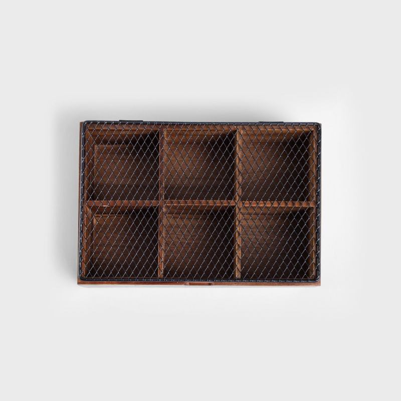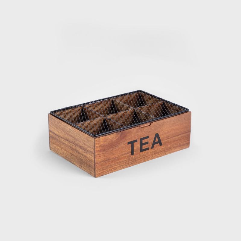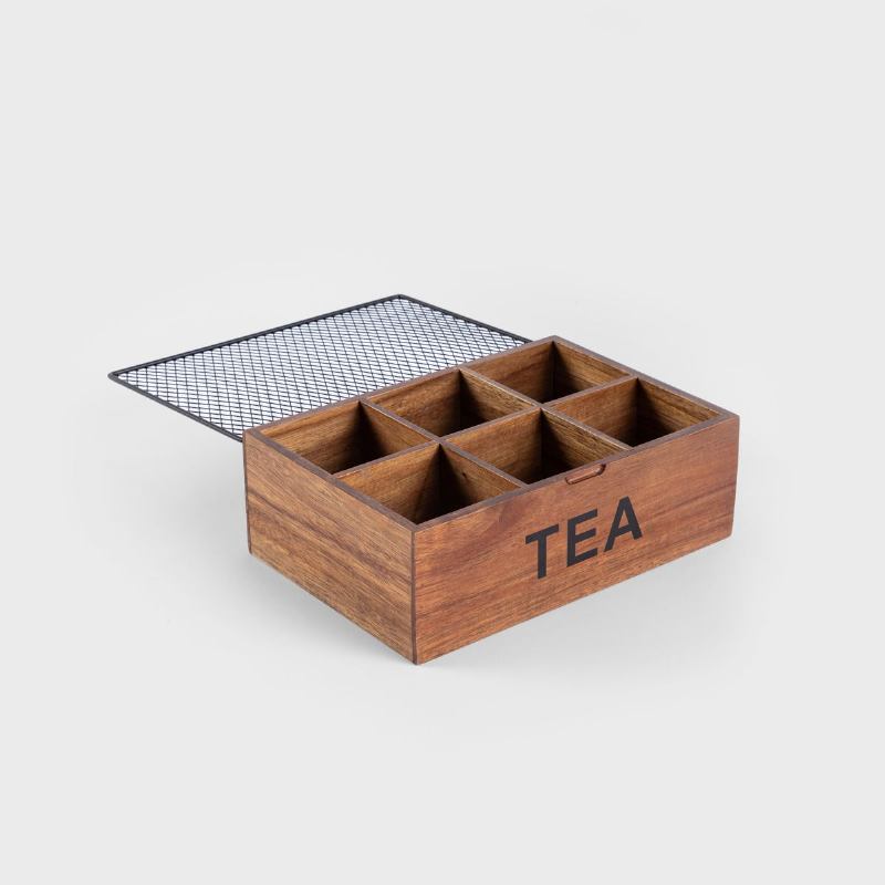 Organizer za čaj MOOKA izrađen je od akacijevog drva s poklopcem od nehrđajuće čelične mreže. Sadrži 6 odjeljaka za uredno spremanje različitih vrsta čajeva. Kombinacija prirodnog drva i metalne mreže daje mu prepoznatljiv izgled koji se lako uklapa u kuhinje uređene u rustikalnom, kolonijalnom ili modernom stilu.