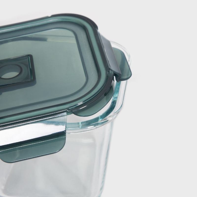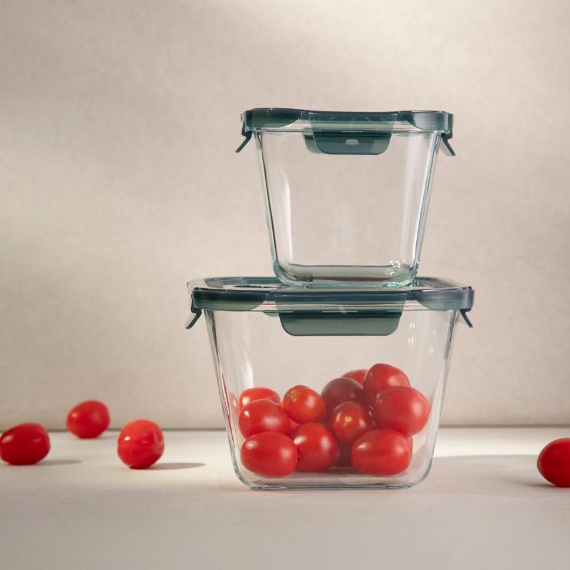 Kvadratni stakleni spremnik kapaciteta 1,85 litara savršen je za čuvanje većih porcija hrane – obiteljskih ručkova, salata ili namirnica za kasniju upotrebu. Izrađen od borosilikatnog stakla otpornog na temperaturne promjene, s silikonskim poklopcem koji osigurava hermetičko zatvaranje i dugotrajnu svježinu. Zahvaljujući praktičnom dizajnu, spremnik je pogodan za hladnjak, mikrovalnu pećnicu (bez poklopca) i prijenos hrane, a može se prati i u perilici posuđa.