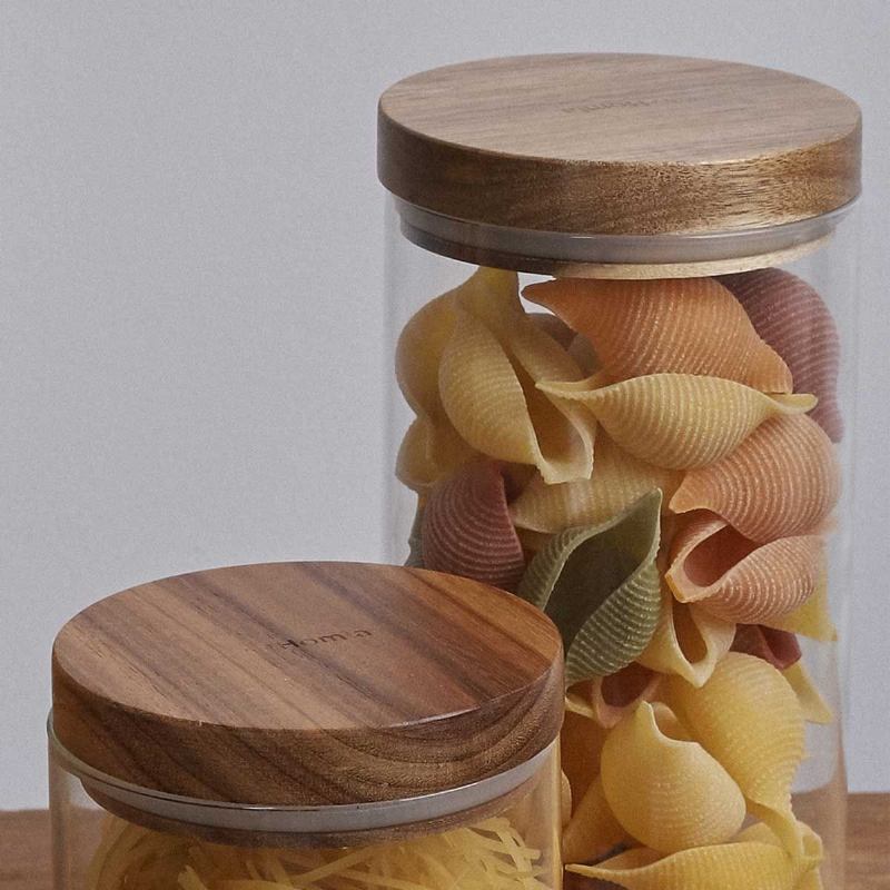 Spremnik HOMLA CARLOS u veličini S s poklopcem od akacije funkcionalan je dodatak za svaku kuhinju. Zahvaljujući prozirnom staklu i prirodnom drvu, savršeno se uklapa u interijere u scandi, boho i minimalističkom stilu. Osim što pomaže u organizaciji kuhinjskih ormarića, štiti suhe namirnice od vlage i štetnika, poput moljaca.
