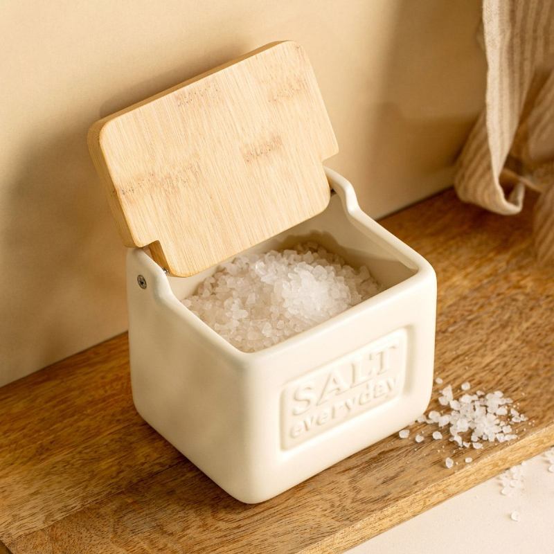 Namjena: Idealna za svakodnevnu upotrebu – bilo da je postavljena uz štednjak ili kao dekorativni dodatak na kuhinskom pultu. Zahvaljujući poklopcu koji se lako otvara, sol je uvijek pri ruci, a estetski izgled čini je i ukrasnim elementom tijekom serviranja jela.
