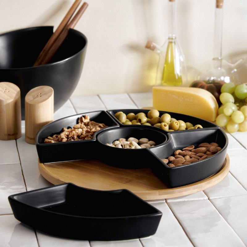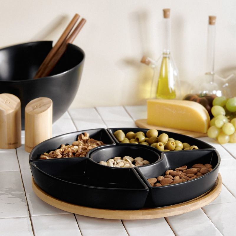 Pladanj HOMLA FINCAN s pet crnih zdjelica i rotirajućom bambusovom bazom savršen je za posluživanje grickalica, umaka i predjela tijekom obiteljskih okupljanja i zabava. Kombinacija elegantne crne boje i toplih tonova prirodnog drveta čini ga idealnim dodatkom za moderne, minimalističke i skandinavske interijere.