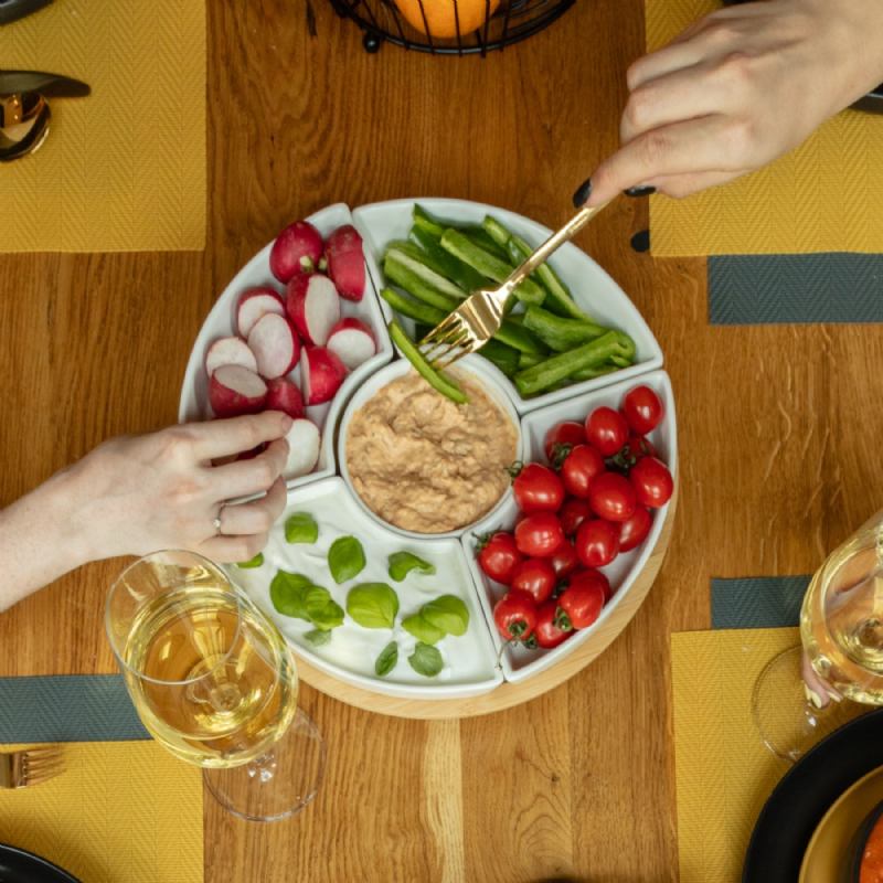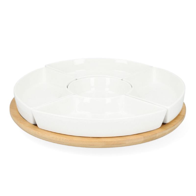 Rotirajući pladanj za posluživanje HOMLA FINCAN savršen je za serviranje grickalica, umaka i malih zalogaja tijekom zabava i obiteljskih okupljanja. Sastoji se od pet odvojenih porcelanskih zdjelica raspoređenih u krug na bambusovoj podlozi koja se okreće, što olakšava dijeljenje hrane za stolom. Kombinacija klasične bijele boje i prirodnog drveta uklapa se u moderne, skandinavske i minimalističke interijere.