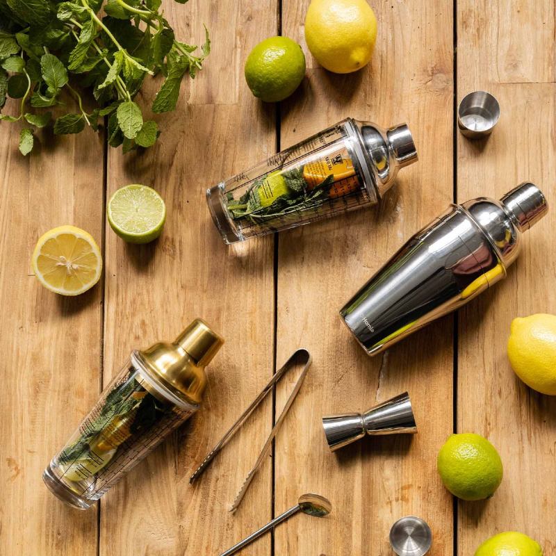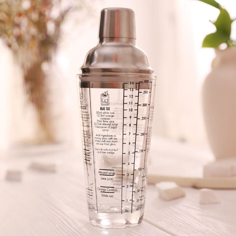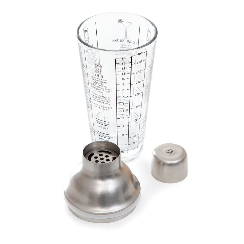 Shaker sa srebrnim poklopcem idealan je dodatak za kućnu pripremu koktela. Sastoji se od prozirne staklene boce s otisnutim receptima za 6 popularnih pića, mjernom skalom i poklopcem od nehrđajućeg čelika sa silikonskom brtvom za sigurno zatvaranje. Zahvaljujući elegantnom dizajnu, uklapa se u moderne kuhinje i barove.