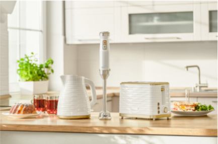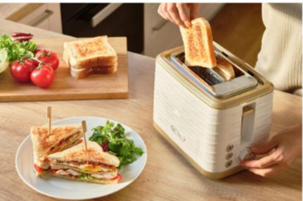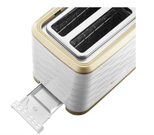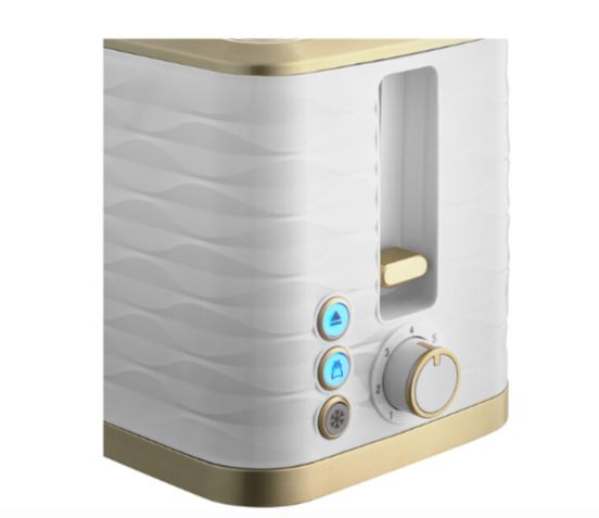 Ovaj elegantni električni toster s bijelo-zlatnim dizajnom idealan je dodatak svakoj kuhinji.