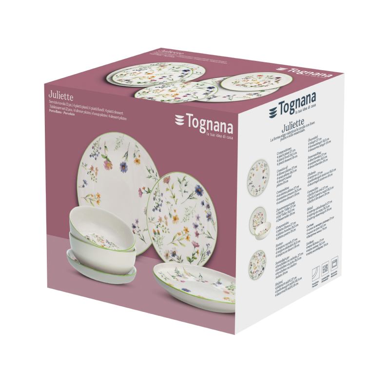 Servis za stol od 12 dijelova iz kolekcije EDGE JULIETTE donosi profinjenu estetiku s nježnim cvjetnim motivima u multicolor izvedbi. Dekor JULIETTE unosi toplinu, eleganciju i romantičan karakter u svaku postavu stola, čineći ga idealnim za svakodnevnu upotrebu, ali i za posebne prigode. Moderna forma EDGE kombinira čiste linije i dekorativnu razigranost, stvarajući skladan i vizualno privlačan servis.