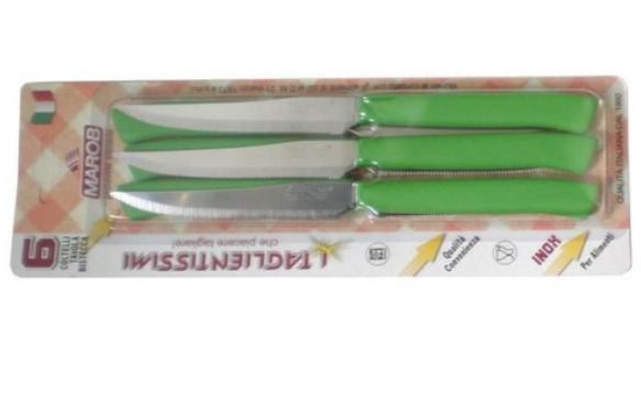 Set noževa 6/1 nazubljeni s PVC drškom u zelenoj boji savršen je za svakodnevnu upotrebu u kuhinji. Ovi noževi s oštricama duljine 11 cm idealni su za rezanje kruha, povrća i drugih namirnica. PVC drška osigurava udobnost i sigurno rukovanje, dok nazubljeni dizajn oštrice omogućuje precizno rezanje.