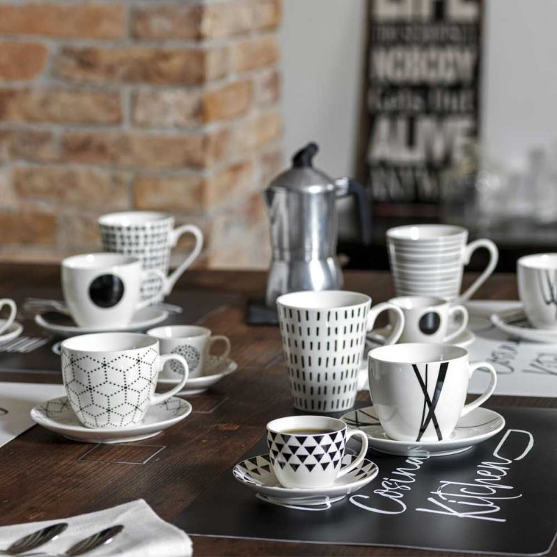 Elegantan set porculanskih šalica s tanjurićem, ukrašen grafičkim uzorkom, savršen za posluživanje omiljenih toplih napitaka. Kvalitetan materijal osigurava dugotrajnu upotrebu uz lako održavanje.