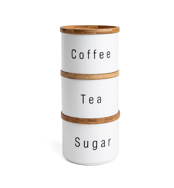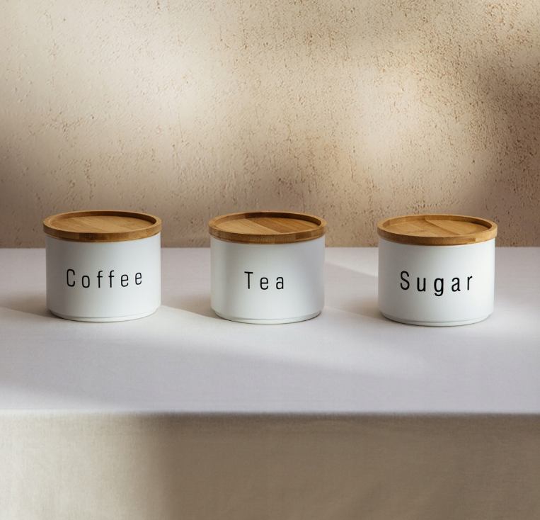 Set posuda za kavu, čaj i šećer sastoji se od tri posude u bijeloj boji, idealne za organizirano i estetsko čuvanje omiljenih napitaka i dodataka. Svaka posuda ima poklopac koji štiti sadržaj od vlage i zadržava svježinu. Neutralna boja i jednostavan dizajn lako se uklapaju u različite stilove kuhinje.