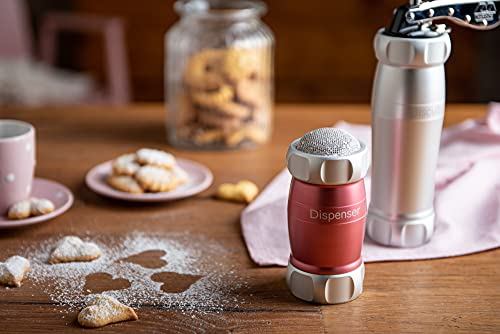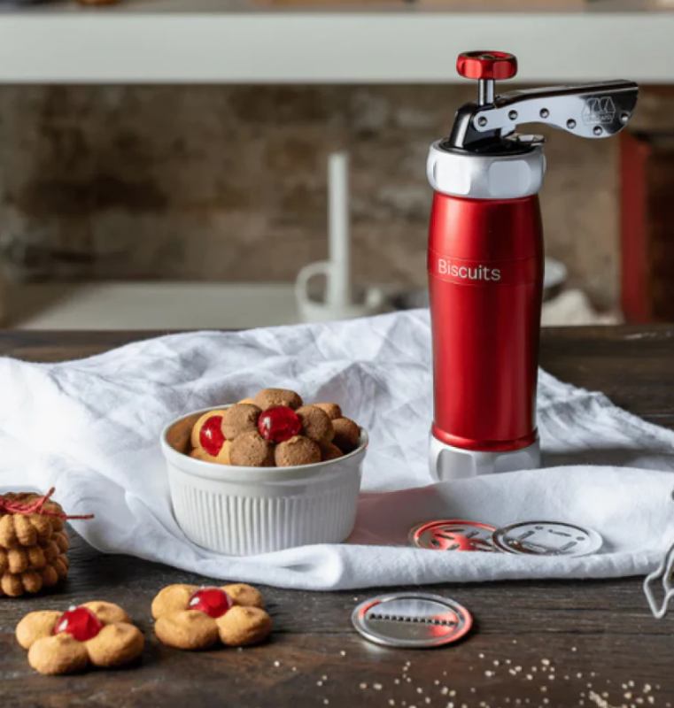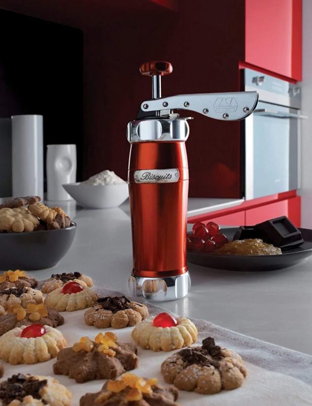 Marcato praktični set za izradu keksa omogućuje vam da u kućnoj kuhinji pripremite savršene domaće kekse i slastice. U kutiji se nalazi stroj za izradu keksa s nastavcima te posipač za brašno ili šećer u prahu u atraktivnoj crvenoj boji. Set je izrađen od kvalitetnih materijala koji osiguravaju dugotrajnost, jednostavno korištenje i sigurnost za zdravlje.