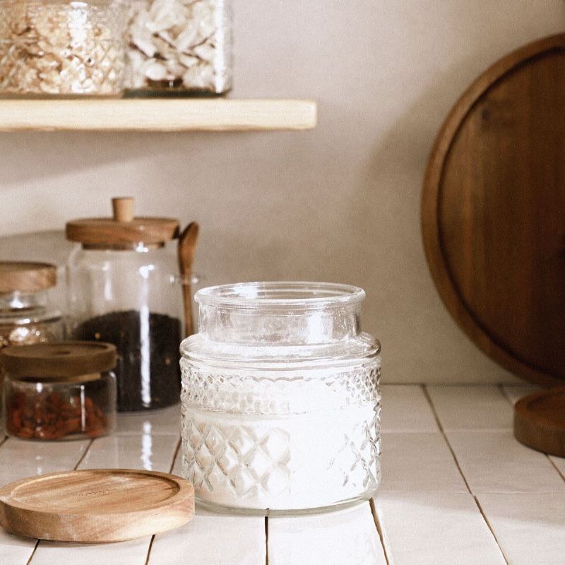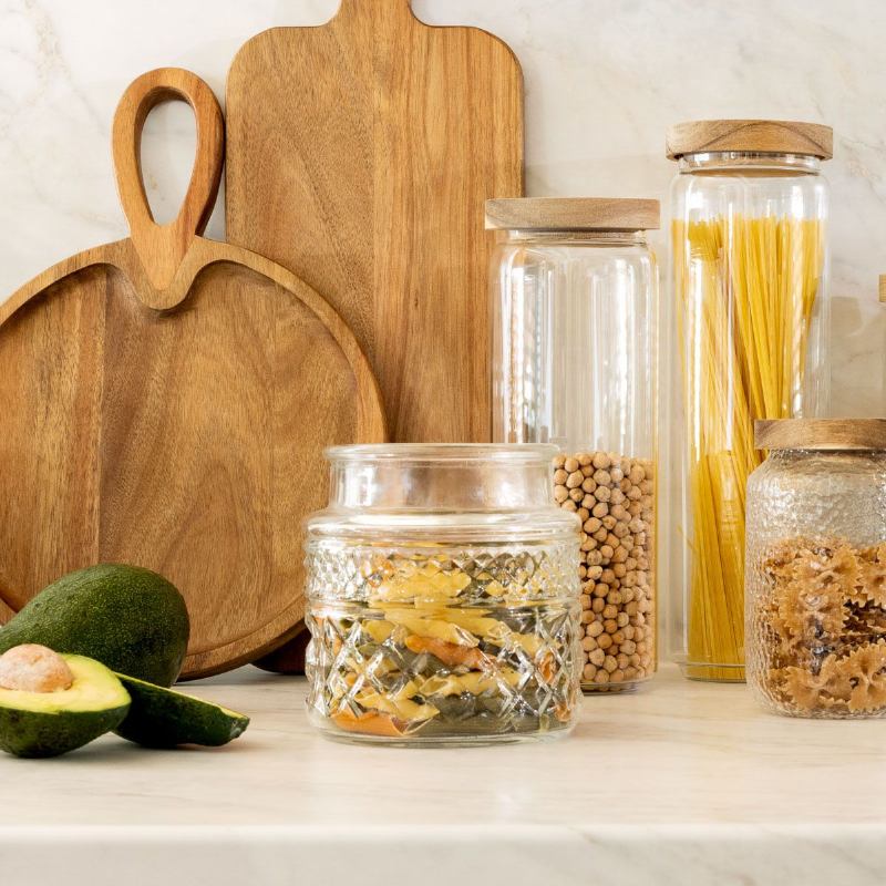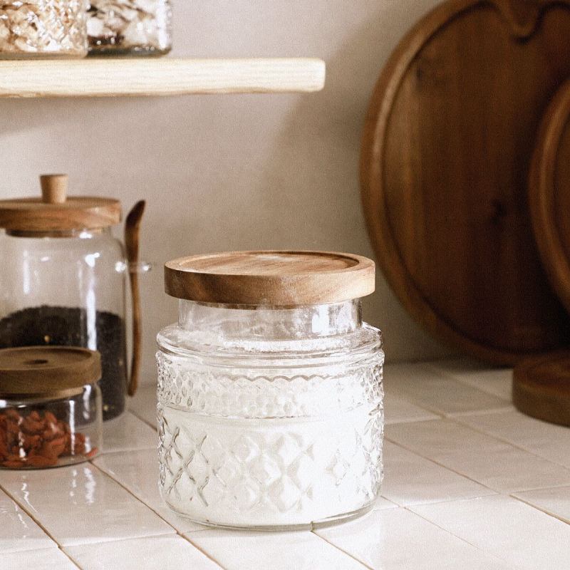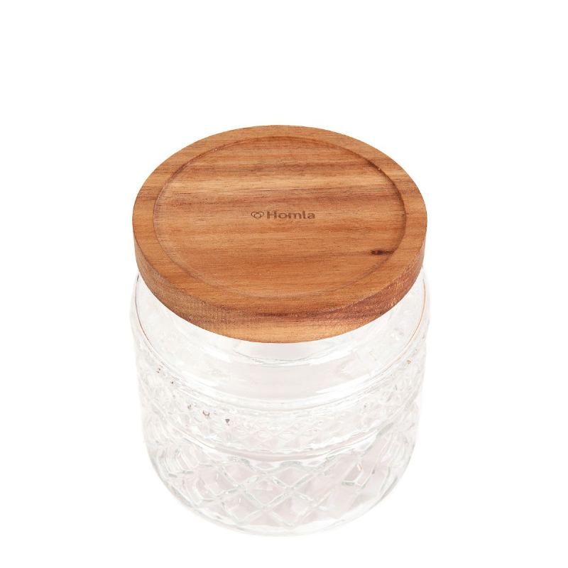 Stakleni spremnik MOLADRI kapaciteta 1 l izrađen je od prozirnog stakla s dekorativnim žljebovima. Poklopac je od akacije. Pogodan je za pohranu suhe hrane.
