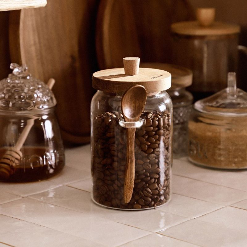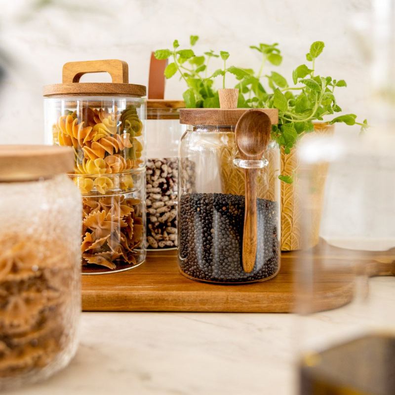 Spremnik CARLOS izrađen je od prozirnog stakla. Ima drveni poklopac sa silikonskom brtvom i bočni držač za žličicu. Kapacitet spremnika je 900 ml.