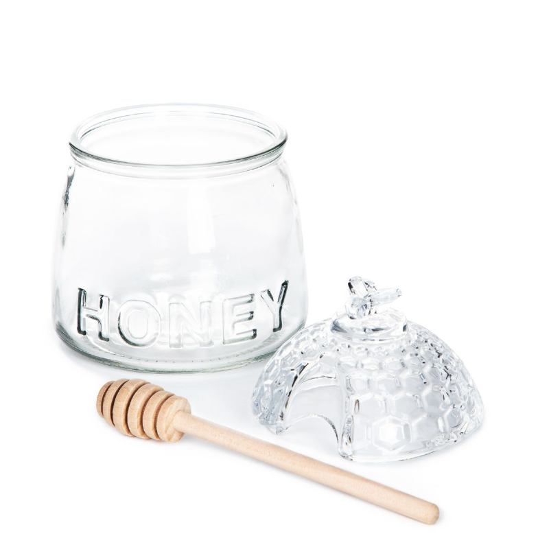 Spremnik REGEL izrađen je od prozirnog stakla. Ima široki otvor (8 cm) za jednostavno punjenje i vađenje meda. Poklopac je ukrašen uzorkom saćastog plasta i figurom pčele. Uključena je drvena žličica za med, koja se umeće kroz otvor u poklopcu.