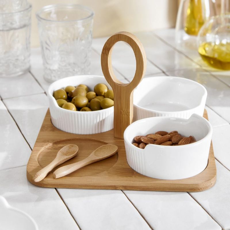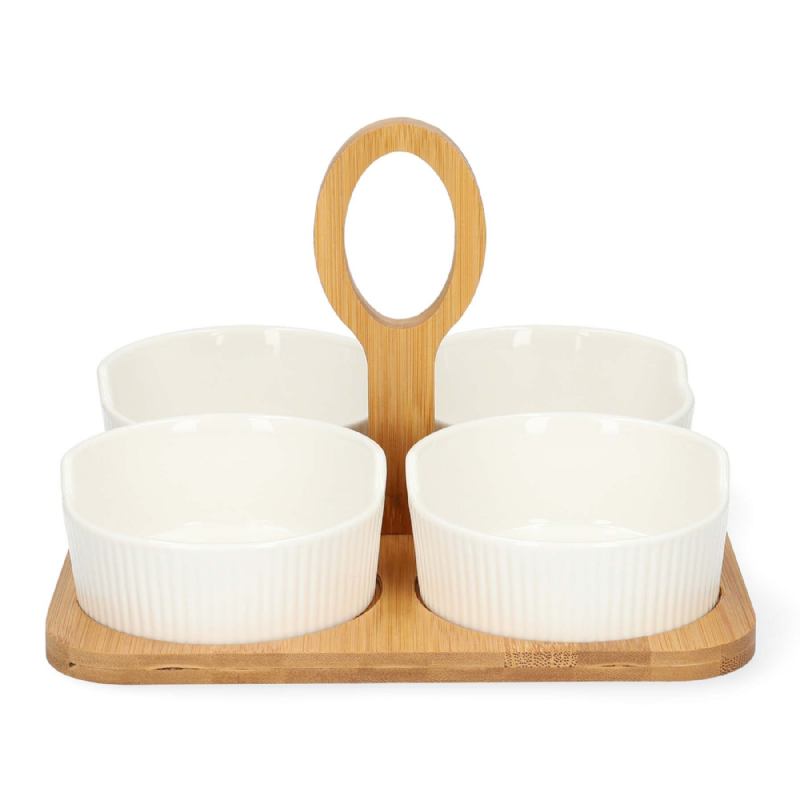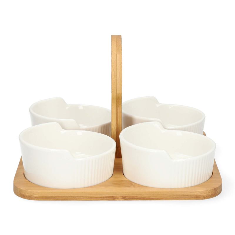 Set se sastoji od 4 posudice promjera 10 cm i visine 5 cm, smještene na drvenoj podlozi dimenzija 21 × 21 × 13,5 cm, koja olakšava organizaciju i održavanje urednosti na stolu.