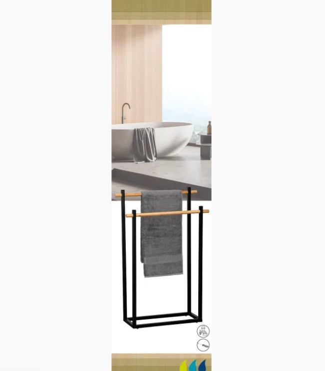 Samostojeći držač ručnika s 2 prečke savršeno rješava problem neurednog odlaganja ručnika u kupaonici. Kombinacija crne boje i bambus detalja stvara moderan i topao vizualni dojam koji se lako uklapa u različite stilove uređenja – od minimalističkog do skandinavskog.