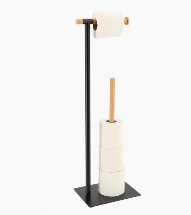 Istovremeno elegantan i funkcionalan, ovaj samostojeći držač za toaletni papir savršeno kombinira moderan dizajn s prirodnim detaljima. Crna metalna konstrukcija donosi dozu sofisticiranosti, dok bambus šipka pruža toplinu i služi kao praktičan prostor za skladištenje rezervnih rola. Zahvaljujući svojim kompaktnim dimenzijama, odlično se uklapa i u manje kupaonice, bez kompromisa na estetici ni praktičnosti. Sve što vam treba – na dohvat ruke, u jednom elegantnom komadu.
