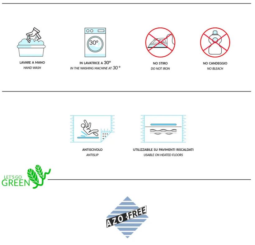 Može se prati u perilici rublja na 30°C, ne upija mirise i izrađen je netoksičnim bojama, čime osigurava sigurnost i higijenu – posebno u kuhinji i najfrekventnijim dijelovima doma.
