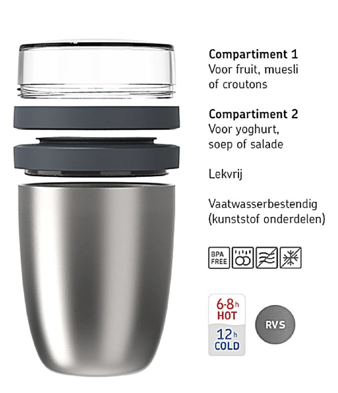 Tamno plavi lonac za topli ili hladni ručak idealan je za svakodnevnu upotrebu. Njegova unutrašnjost termosice omogućava da sadržaj ostane vruć 6-8 sati, a hladan najmanje 12 sati, što ga čini savršenim za juhu, jogurt ili druge obroke. Lonac je izoliran i podijeljen na dva prostrana pretinca, oba zatvorena vlastitim poklopcem. Donji pretinac ima kapacitet od 500 ml, dok gornji može primiti do 200 ml, savršeno za dodatke poput muslija, krutona ili voća. Zahvaljujući nepropusnom dizajnu, lonac osigurava da u torbi neće doći do nezgoda.