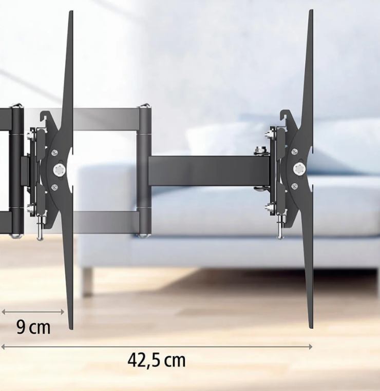 Zidni nosač s potpunim pokretom namijenjen je za postavljanje televizora dijagonale od 32" do 65". Omogućuje okretanje, naginjanje i izvlačenje, čime pruža maksimalnu fleksibilnost gledanja iz različitih kutova. Zahvaljujući Easy-Fix sustavu, orijentacija televizora može se jednostavno prilagoditi, a montaža se izvodi u samo tri koraka. Ugrađena libela i priloženi šablon za bušenje dodatno olakšavaju instalaciju.